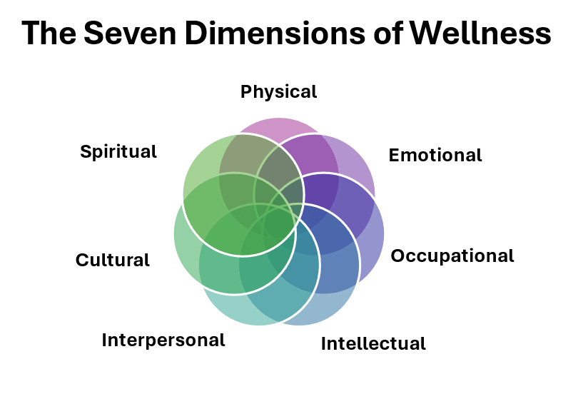Different schools outline slightly different dimensions, but in general, we can state that holistic wellness is made up of 7 dimensions. Our choices in all these areas will define how well we feel: