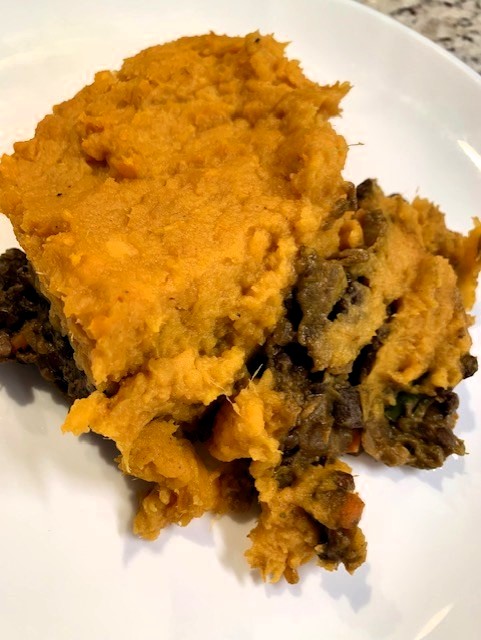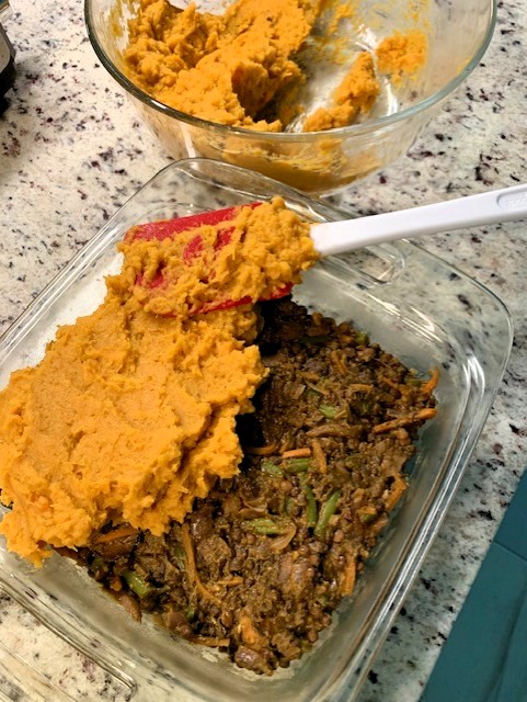 - Scoop the lentil filling into the baking dish. Top with the sweet potato mash.