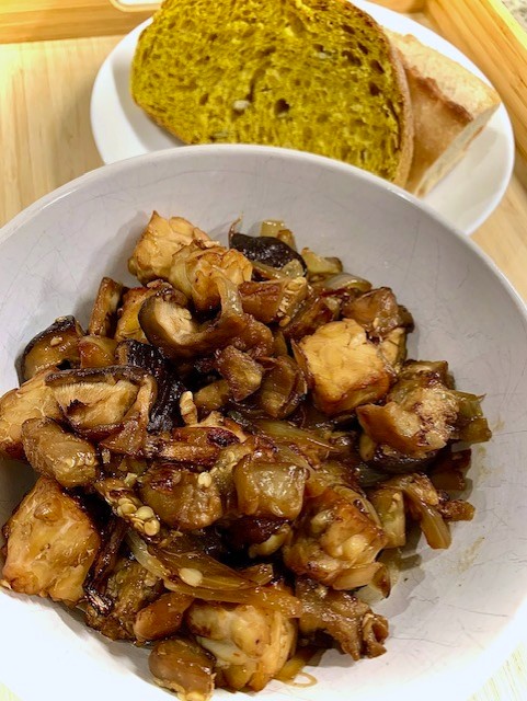 - Add tofu, eggplant, shiitakes and onion to a large bowl.