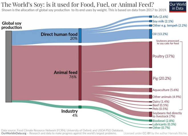 According to the International Institute for Sustainable Development (IISD), in 2024 76% of the world’s soy was fed to farmed animals. In contrast, only a modest 20% of the world’s soy is used for humans, including soybean oil production. The Sustainable Nutrition Initiative (SNI) indicates that traditional soy-based foods such as tofu, soy milk, tempeh, and edamame beans make up just 7% of soy use.
