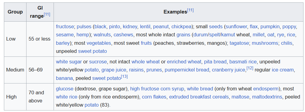 The GI represents how much a food raises blood glucose when absorbed. Glucose itself has a value of 100, and It ranges from 0 to 100. A GI less than 55 is considered low, a GI between 56 and 69 is considered medium, and GI more than 70 is high. Notice that, unless we eat a food on its own, the global GI of a full meal will be a combination of the individual foods. So a meal made up of low GI foods will be low GI, whereas a meal with both high and low GI foods in similar amounts will have a medium GI. Another interesting concept is Glycemic Load (GL), that also considers how fast the sugar levels are raised.