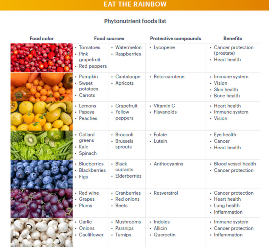 - the pigments that give these foods their bright color often reflects different phytochemicals and nutrients, like antioxidants and vitamins, and each group supports health in different ways. By eating all the colors of the nutrition rainbow, we harness the power of all these health promoting foods, resulting in a broader disease protection.